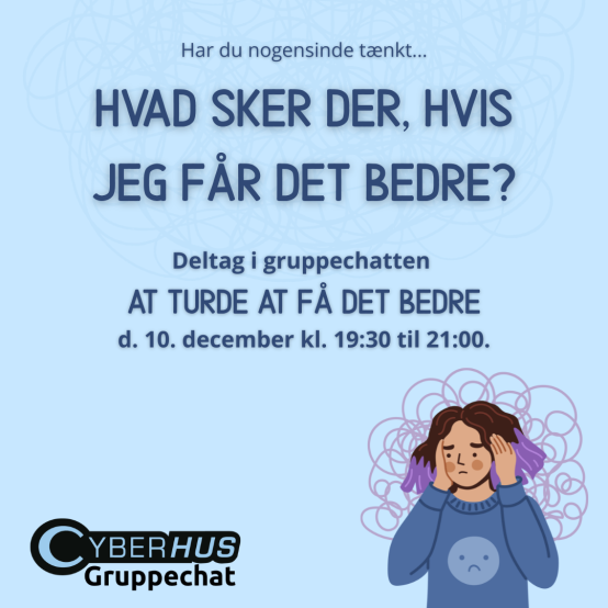 I chatten skal vi tale om, hvad der skal til, før man tør begynde at få det bedre. Vi skal bl.a. chatte om, hvad man kan frygte ved at få det bedre, hvordan man arbejder med bekymringerne, og hvordan man overvinder frygten og begynder at tage de første små skridt mod at få det bedre.