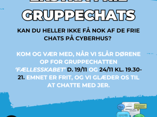 Så kan du også deltage i gruppechats her på Cyberhus. Nogle gange er vi også med, og så kan du deltage direkte her fra siden.